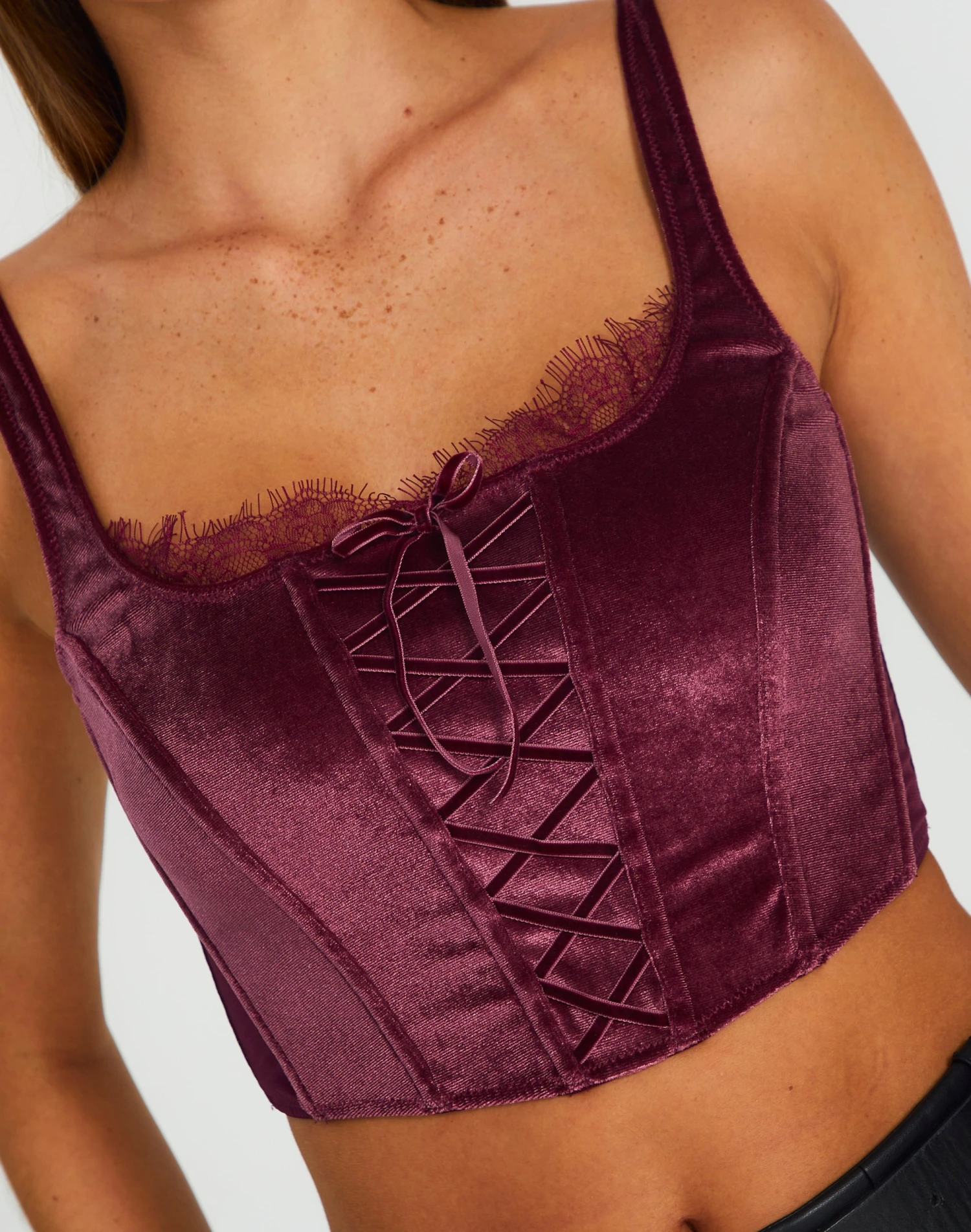 Be the first to review “Velvet Tie Front Lace Trim Corset Top” Cancel reply